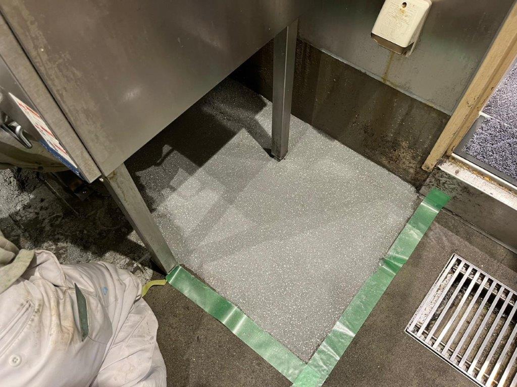 - 早く固まるタイプの塗床材なので、朝の仕込業務に影響が出ません。