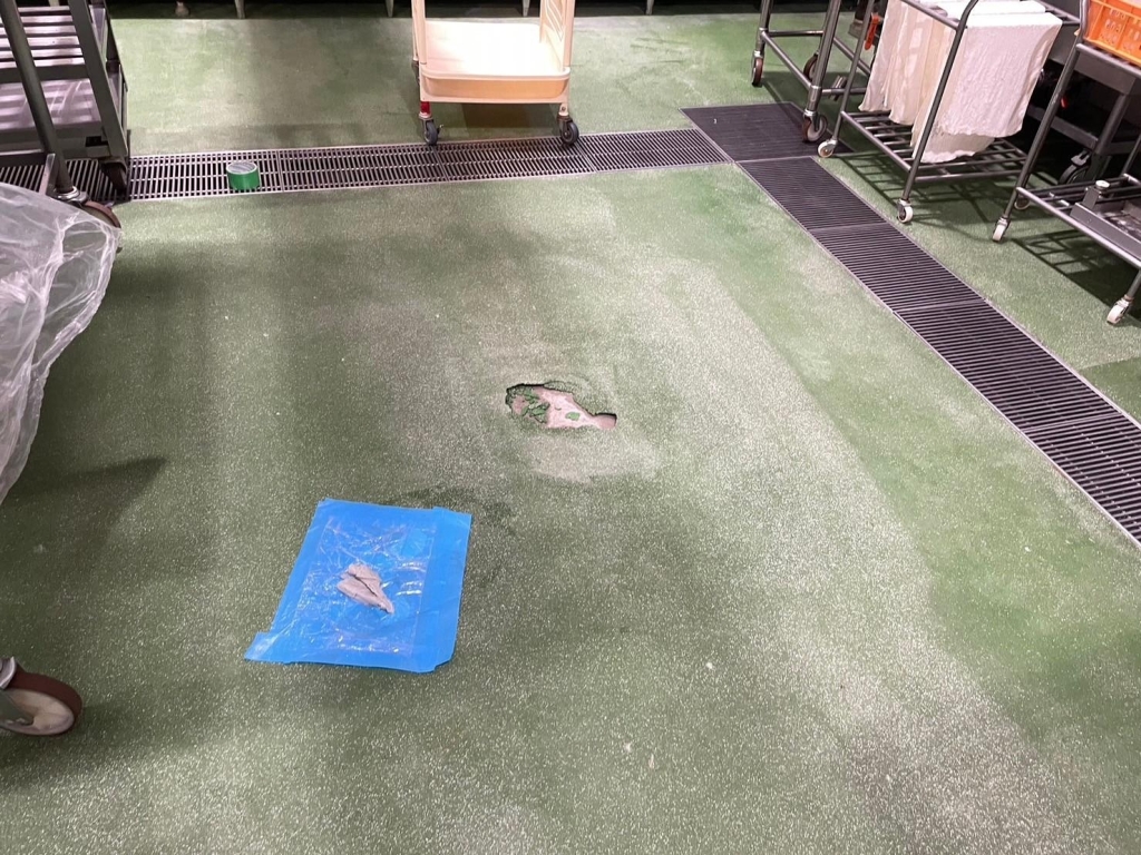 | 施工条件 | ■周囲にホコリを付着させないように、ビニールで囲って養生を徹底してから床塗装工事を進めてほしい。 ■既存の床と同じような塗床材で補修してほしい。 ■9時〜16時で作業を終えてほしい。 |