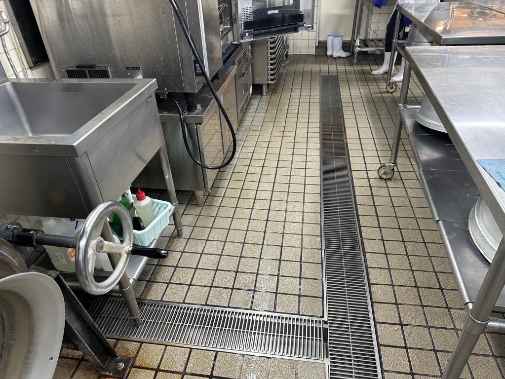 - 作業中は常に滑るので調理場で働くスタッフがおっかなびっくり歩いている。