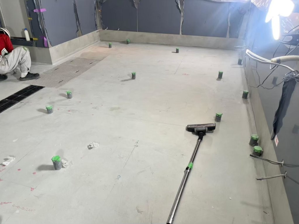 床全面を研磨して表面のレイタンスや不陸を除去。さらに産業用掃除機で丁寧に清掃し、塗料の密着性を高めます。