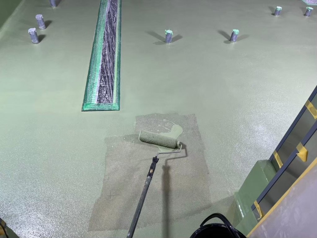 コンクリートと塗床材の密着を確実にするため、プライマーをローラーで均一に塗布。