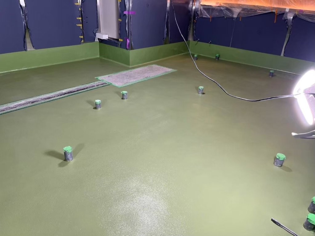 床全体が光沢感のあるグリーン系の塗床に仕上がり、防塵性・防滑性ともに高い厨房床が完成しました。