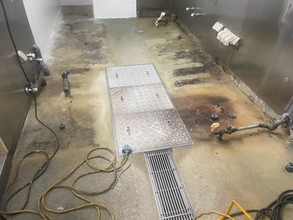 段差や水溜まりのない美しい厨房床が完成しました。