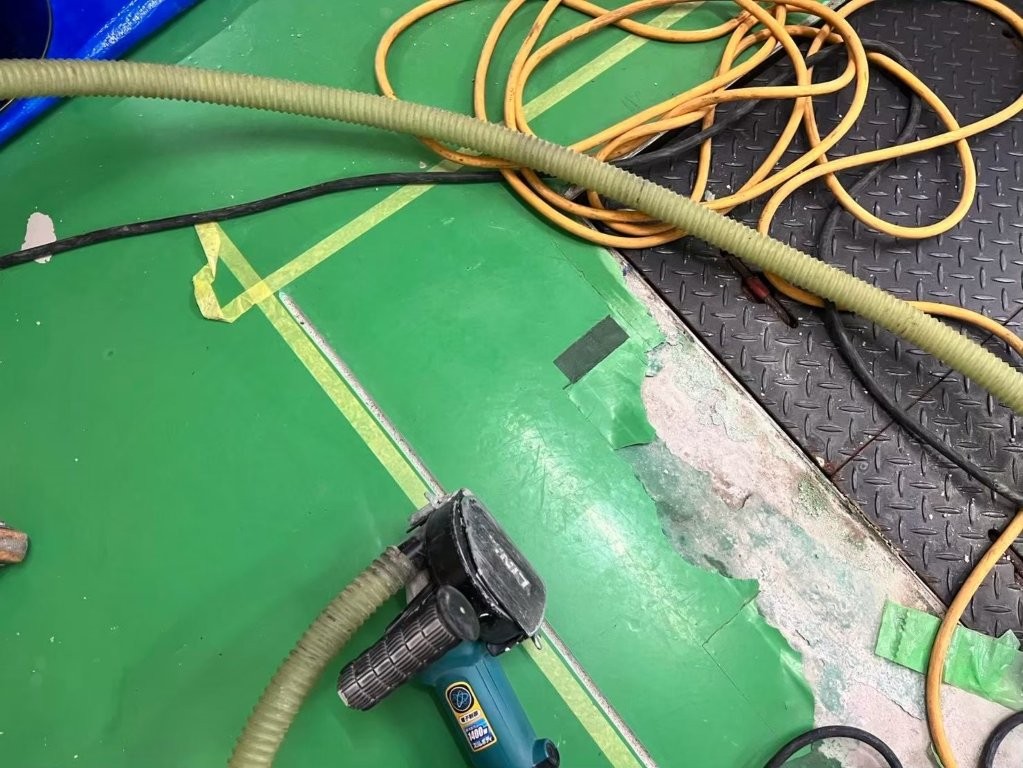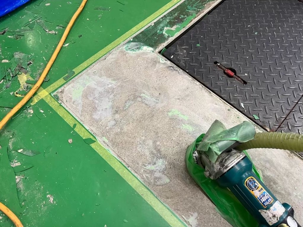 床面の塗膜が大きく剥がれ、下地がむき出しになっている状態でした。