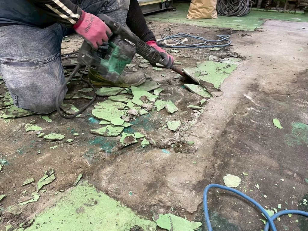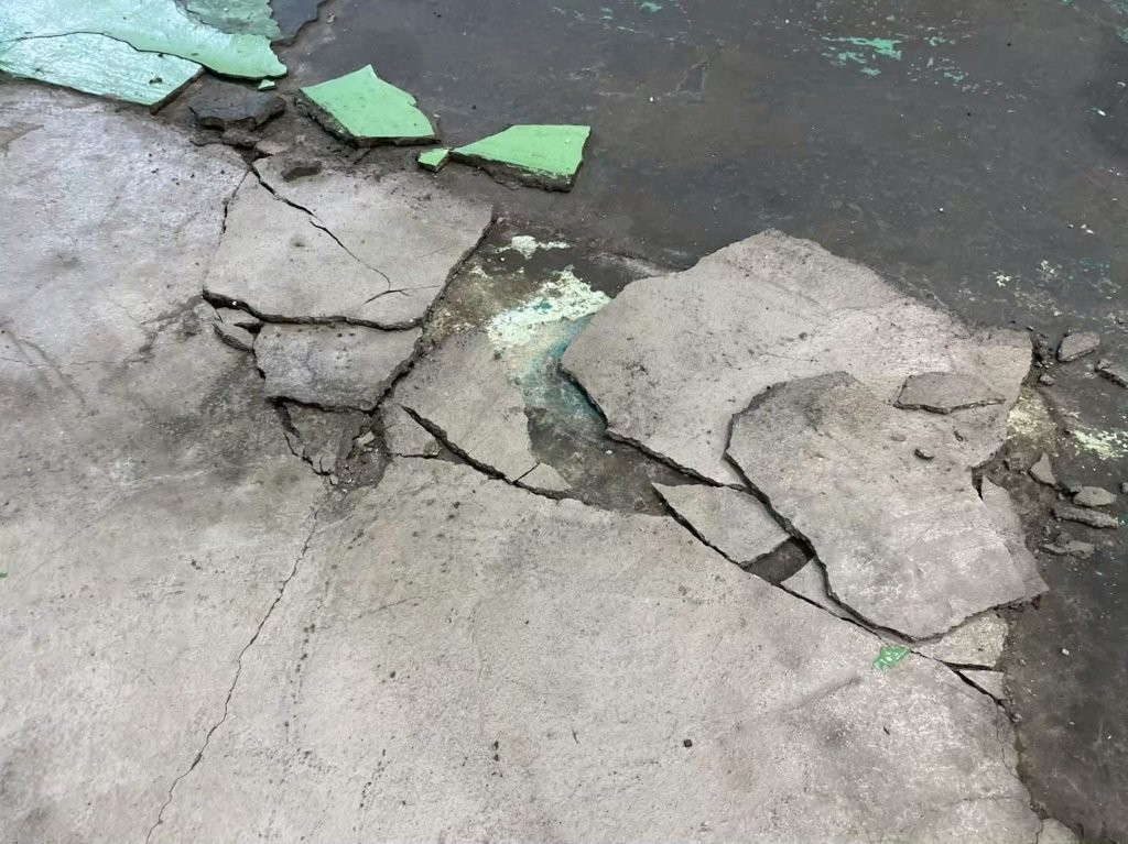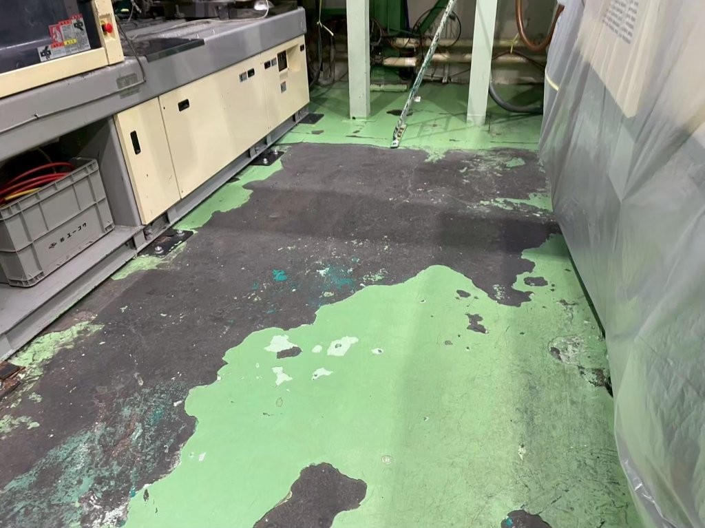 - 長年の使用で床塗膜が激しく剥がれ、コンクリートが露出している。