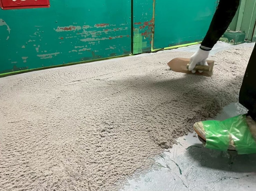 不陸の大きい箇所には厚みを持たせてモルタルを塗り込み、床面を均します。