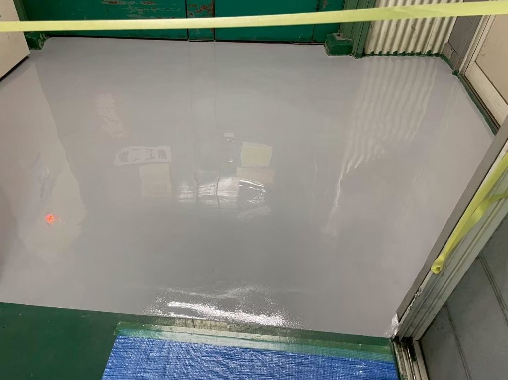 下地の不陸をしっかり補修してから塗布しているため、塗膜が均一で非常に滑らかです。仕上げ前段階ですが、この時点で床面の精度と強度がしっかり確保しました。