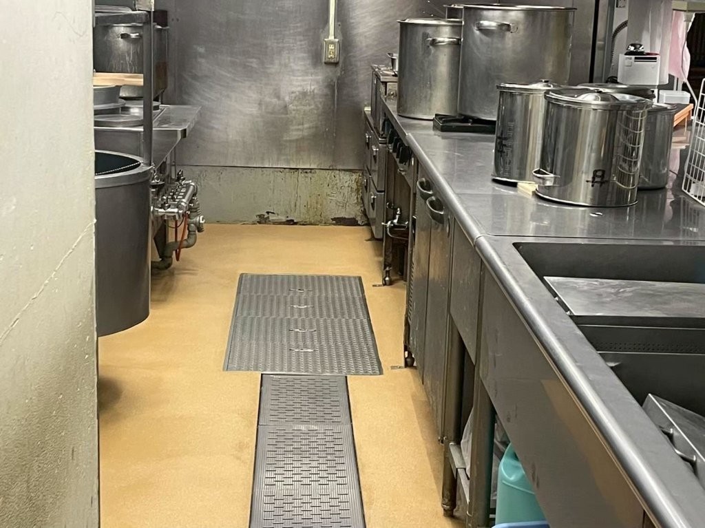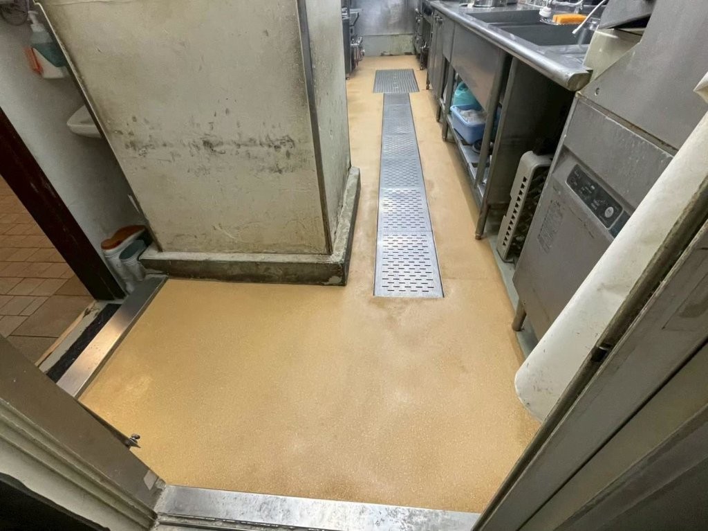 防滑性と清掃性を兼ね備えた、明るく衛生的な厨房床に仕上がりました。