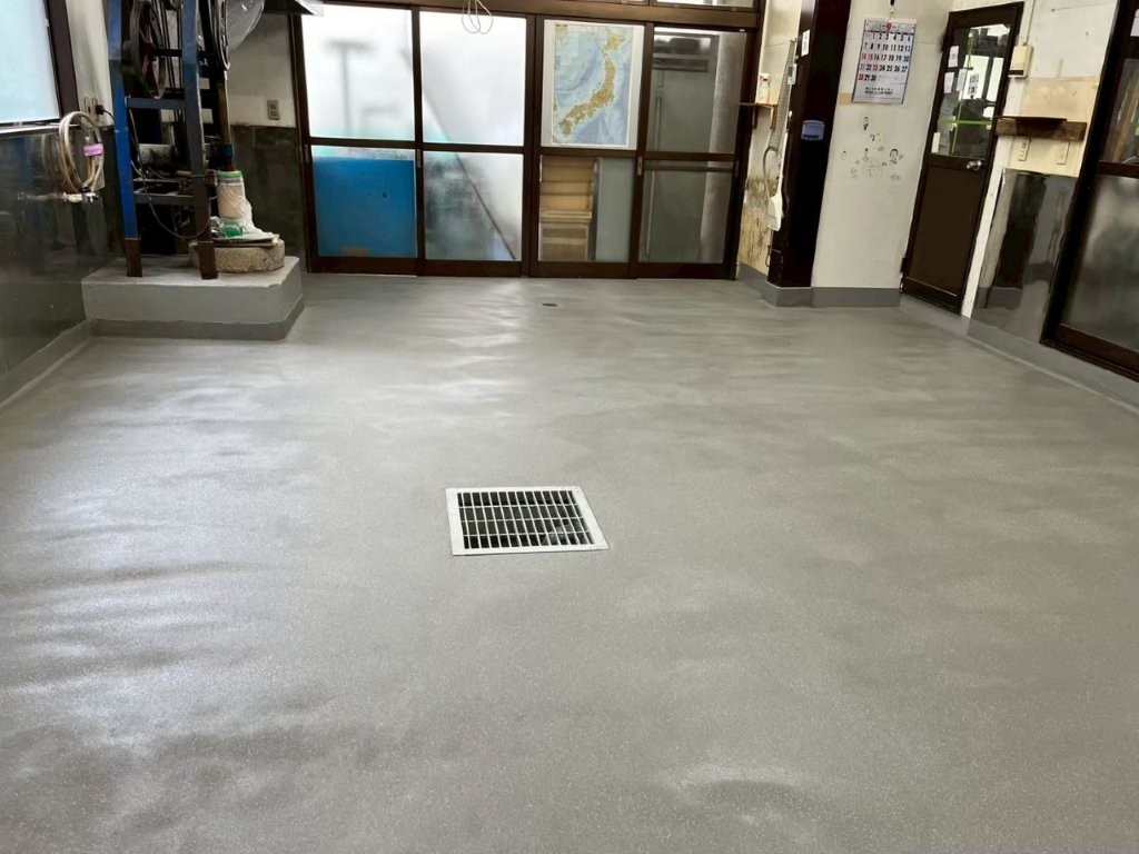 施工後は、床面全体がフラットで均一な仕上がりとなり、排水まわりを含めて使いやすい作業環境へ改善しました。清掃性や衛生面にも配慮した床へ整えています。