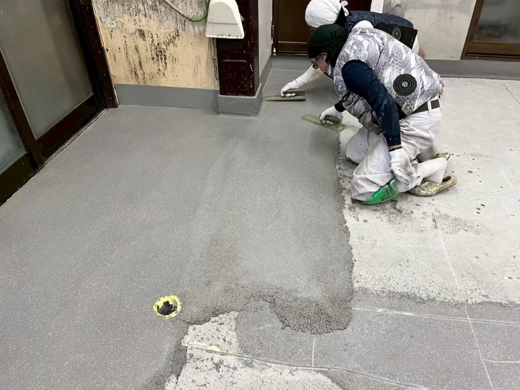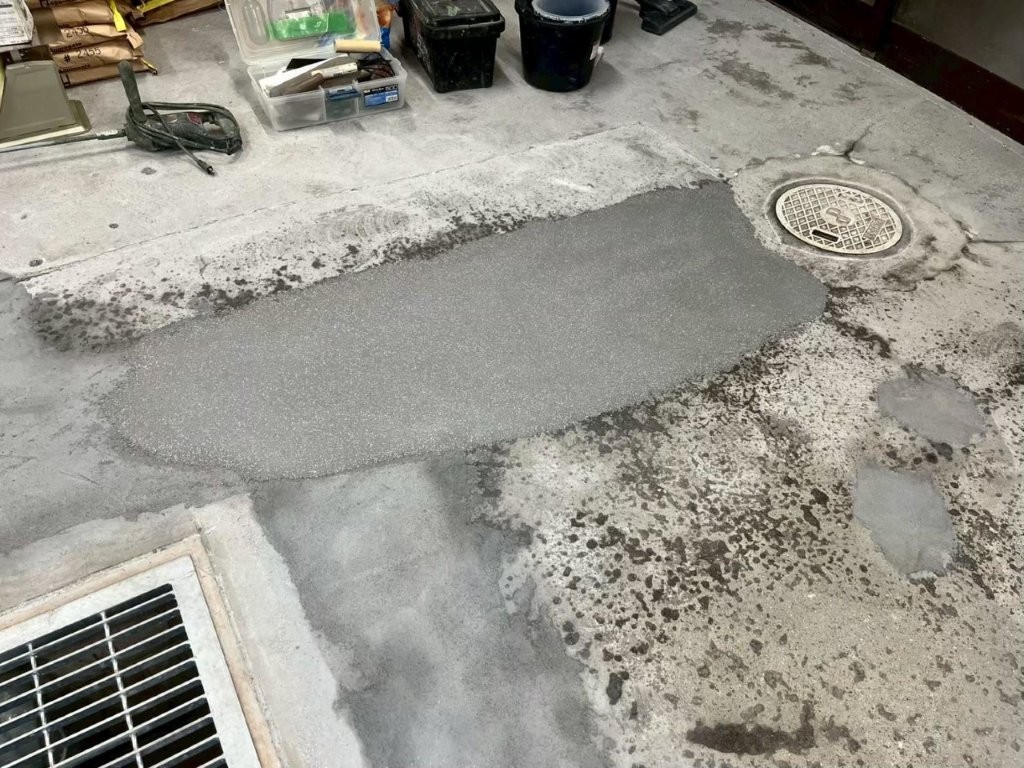 欠損部を補修したうえで、床面全体の不陸を整えました。排水まわりの納まりにも配慮し、水溜まりが発生しにくい床面づくりにつなげています。