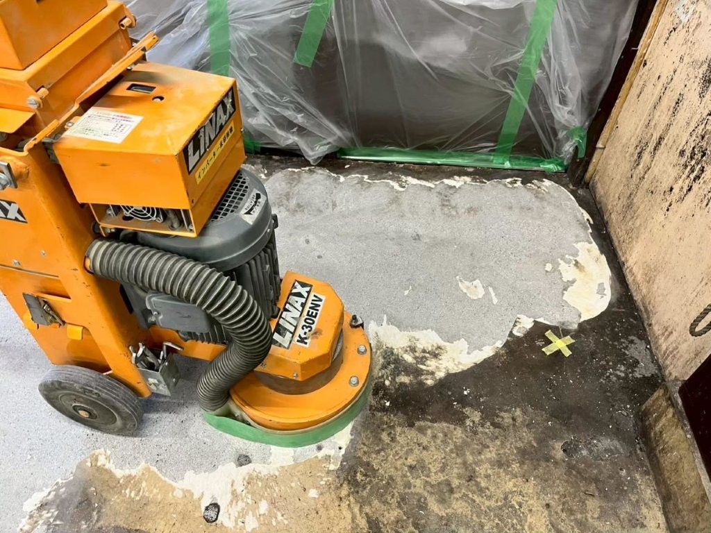 既存塗床や脆弱部を整理するため、床研磨機を使用して下地処理を行いました。塗床工事では下地処理の精度が仕上がりに影響するため、密着面をつくる工程として丁寧に進めています。