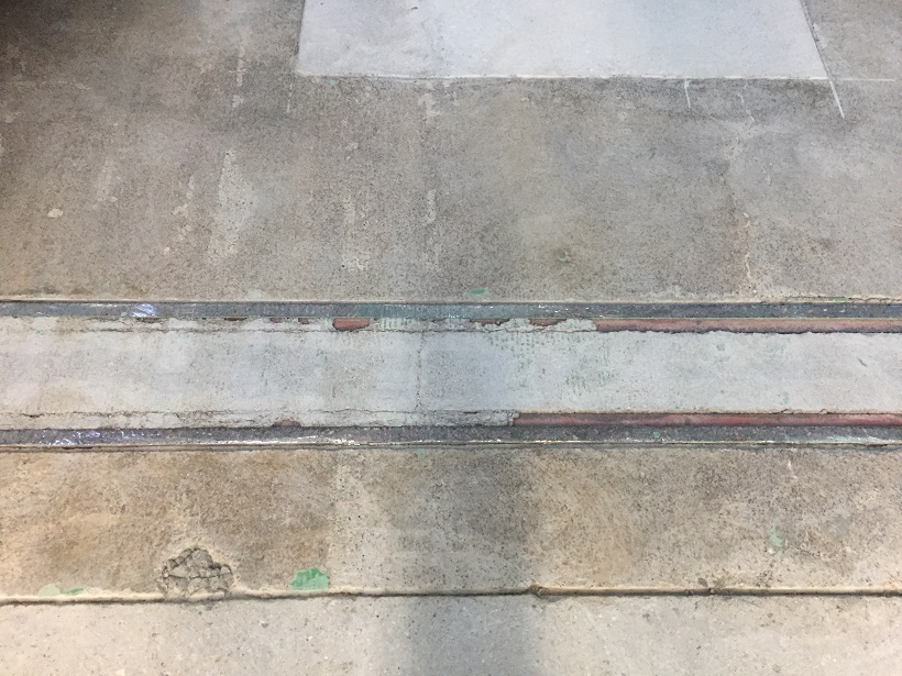 【光コーティングの解説】あちこちに、コンクリートを打ち継いだ部分が見られました。この位置は、コールドジョイントと言って、コンクリートどうしが一枚岩になっていませんので、塗床にクラックが発生する可能性がある場所です。カッターで切り込んでエポキシ樹脂を流すことで補強をします。仕上がればわからなくなる場所ですが、ココをきちんと施工することが大事です。使わなくなった金属製のレールも埋めました。