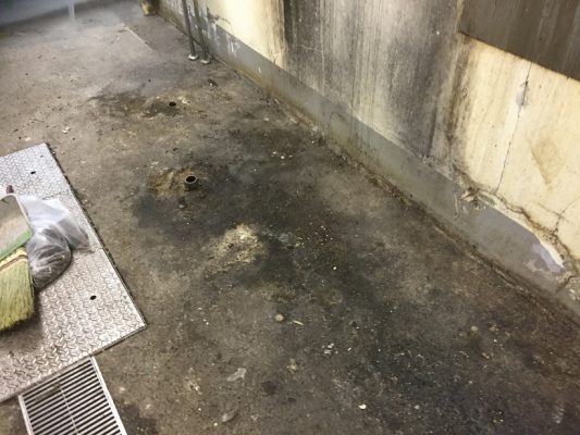 厨房のコンクリート床に穴が空いたり凹ができると、水が溜まります。
