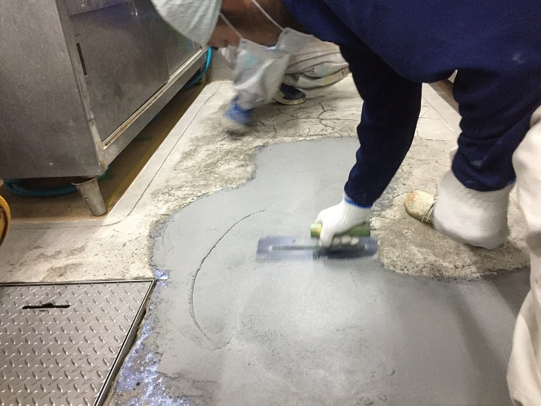 【光コーティングの解説】速硬化下地材60で凹部を埋めてフラットにします。この材料は1時間くらいで硬化し、塗床の施工が可能になる優れものです。